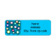 Dessa returetiketter har en geometrisk utformning av cirklar av olika färg och linjer kommer ut på en fält av blått.