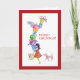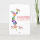 Illustration av en flicka som bär en torn av färgade gåvor, två hundar som springer på hennes fötter och en katt som är balanserad överst i pilen. Underbara kort och gåvor till alla tillfälle.