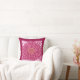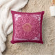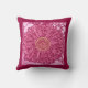 Dekorativ kudde i ett tryckt block av en Gerbera-daisy, baserat på ett fotografi, digitalt förändrat och handfärgat - nyanser av fuchsisk rosa med djup maron/burgundy och snäcka rosa, med djup maron/burgundy gräns