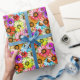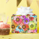 En bild av färgstarka gerberablommor i gult, lila och rosa. En sjudande blommigt av vackra trädgårdsblommor.