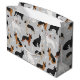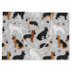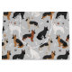 Cute German Shepherds in black and tan, black and red, black and silver, white and back color coats sit and stand with scattered dog bones and paw prints on a light gray background.