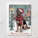 Colorful and joyful Christmas design with a German Shepherd wearing a Santa hat.