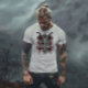 En mörk gotisk designad t-shirt med en stor getskalle med ett människo kranium på varje sida. Det finns en pentagram längst ner och blod som droppar från hela bilden.