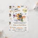 Den här inbjudan till babyduschen har ett Halloween-tema med ett heligt spöke i en lila häxhatt, som håller en pumpkin basket. En svart katt sitter i en kaskuldron, bredvid baby flaska, pumpor och ballonger. Fladdermus flyger mot ett fullt, med bwebb och spooky grenar som sätter upp utformningen.