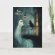 Happy halloween hälsning med en underbar roligt Halloween-scen med ett spökchatt med en svart katt på balkongen