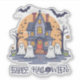 Det här är ett sött Halloween-klistermärke med söt spöken framför en hemlig mansion. Du kan anpassa standardtexten "HAPPY HALLOWEEN".