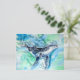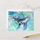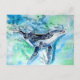 traditionell vattenfärgsmålning av det gigantiska utseendet av en fuktig val i blå vattenfärger på vykort.