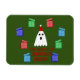 Den här magneten i fantastisk har ett sött julspöke med svart ögon och munnen öppen. spöket bär en feg röd och vit hatt med en pompom på toppen. Det finns glatt röd, blå och grönt presenter som omger spöket. Ett meddelande i fjällröd text under spöket säger "Julklapp Ghost" i fet huvudstad brev. Den här roliga festdesignen passar alla åldrar.