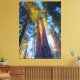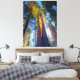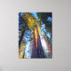 Bilden fångar en låg vinkel syn på hur sekvoia träd torkar i en skog, tittar upp mot himmel. Träd har tjocka, rödbruna trunkar och grönt löv, och vissa löv uppträder i gult på grund av solljus. Himmel syns genom kanopin och ser ut som blått och ljust. I perspektivet betonas träd:s höjd och storhet, vilket skapar en känsla av tolerans och lugn.