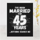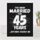 Det är en 45-årsjubileum i bröllop till par som har levt det gifta livet i 45 år och som har sett och hört allt och ingenting skrämmer dem. Perfekt för ett gift par som firar 45 år av giftermål med 45 bröllop-årsdagen av party! Den här noveltyns jubileumsgåva kommer att få många skratt från era make eller fru eller gäster från party. "Jag har varit gift i 45 år Inget Skrämmer mig", lustigt minnesmärke i giftermål.