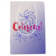 Pinjul av ljusblå stjärnor liknar fyrverkerier som omger texten "Celebrate!" i övertonad färg från rött till rosa (konturerad i svart). Bilden upprepas på motsatt sida. Bakgrund är en mörk blått skuggning till en vit som täcker hela påsen.