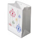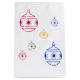 Runddekorationer för helgdag träd, två stora och fyra små, på vardera sidan. Färg av enskilda glober är blå, grönt, röd, orange.