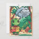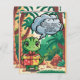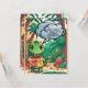 En söt dinosauer baby som presenterar en gåva till födelsedagslungen i en förhistorisk djungel. Det här är ett vackert födelsedagskalkokort för små barn som är i fantastiska varelser och dinosaurier.