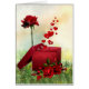 Röd presentlåda, röd ros, röda hjärtan som kommer ut ur presentlådan och skickar en gåva av kärlek hälsningskort. Bakgrund som köps från rör för använda