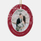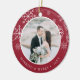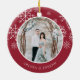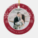 Den förestående fotojulprydnaden för nya lyweder har ett favoritfoto från bröllop på vardera sidan, inramat av vitt snöflingor på pulserande kranbärröd. Anpassa med en anpassningsbar på vardera sidan som visas med "Gift & Merry" på framsidan och namn på baksidan.