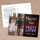 Snygg modern bröllopsflytt eller mindre bröllopsannonseringskort för att informera familj och vänner om att era bröllopsplaner har ändrats, vilket kräver att ni rymmer eller minskar antalet gäster på ert bröllop, men att ni kommer att vara värdar för en fest senare. Framsidan har ert foto på ena sidan och "Gift nu" i vit skrivstil och "Festa senare" i röd och blå typsnitt med en glödande neoneffekt mot en tegelvägg bakgrund. På baksidan kan du anpassa ditt meddelande mer detaljerat och era namn i en signatur-liknande skrift.