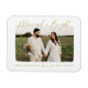Fira din första jul som ett nygift par med vår Married and Bright-julfoto-magnet! Magneten har texten "Married & Bright" i ett modernt, förgyllt, handskrivet typsnitt. Ditt horisontella bröllopsfoto visas med en vit grovkantad ram runt om. Personliggör magneten genom att lägga till en anpassad hälsning med era namn som visas nedan.