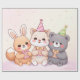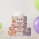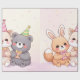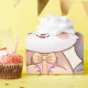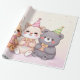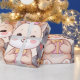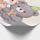 This image shows a neatly wrapped rectangular gift on a wooden surface. The gift is decorated with a red satin ribbon and a shiny red bow. The wrapping paper features cute animal ears and eyes peeking from the bottom, giving it a playful, festive look. Pine branches, pine cones, and colorful ornaments add a Christmas atmosphere to the scene. A pair of scissors and ribbon lie nearby, suggesting the gift is in the process of being wrapped.