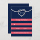 En vit segelrepe som är fastbunden i ett hjärta dekorerar denna OSA på en korall och marin blå strimlad bakgrund, skapar perfekten för nautiskt bröllop eller strandbröllop. Rullan ner för att se resten av insamlingen i bröllop, och om det behövs ytterligare uppgifter kan du kontakta oss på prettyfancyinvites@gmail.com med din begäran.