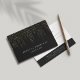 Elegantens presentcertifikat är utformat för visningar av ditt namn och/eller namn i klassiskt vitt tecken på en rikens svarta bakgrund som är adorterad med lodräna av faux guld-folie ljus. Lägg till önskad presentcertifikatsformulering och kontaktinformation för företag på baksidan. Chic och elegant för salonger, makeup artists, hårstilist, spas, boutiques m.fl.