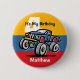 4e födelsedagendesign som presenterar en gigantisk lastbil för blåtttecknad med numrera 4 på chaufför dörr. Randig bakgrund. Roligt för någon pojke som älskar pickupa lastbilar. Skräddarsy den med din egna personliga text. PinkInkArt original!