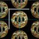 Unik utskrift av en gyllene asiatisk medallion av Vision Studio. En regnbåge av autologt färg i öga, ge medaljonen varmt mot den svarta bakgrunden. Hämta ditt exemplar idag!