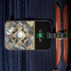 En cirkulär guld-rosette med tunna blommönster och grönt löv är centrerad på en vit marmorbakgrund.