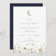 Gilded Crescent Måne adorned med boho wildblomma arrangemang, bröllopsinbjudan. Funktioner, mörk marin blå färg-baksida och modern designmall stil med vildblomsgrönare gräns i grund.