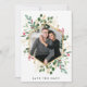 Det här vackra helgdag-bröllop spara datum har ditt personliga foto, omgivet av ett faux guld-geometriskt ram med matchande guld-löv, julgrey och röda hullbär på en modern vit bakgrund. Samma design visas på baksidan, där det finns utrymme att lägga till all viktig information om bröllop. Perfekt för elegantens vinterbröllop.