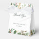 De här vackra helgdag-bröllopsboxarna har elegant faux guld löv, julgrönt och röda hollbär på en modern vit bakgrund. På framsidan står "tack" i elegantens kalligrafi.