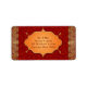 Faux golden kant gör ett gyldat gräns för denna indiska inspirerade adressetikett. Bakgrunden är djupt röd med en subtil övertryckning av mönster allt för att förbättra ett ornat ram som innehåller ett skräddarsytt namn och adress. Ram omges av fyra små guldfärgade paisleydekorationer. Tillgängligt med matchande produkter.