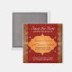 Faux golden kant gör ett gyldat gräns för detta indiska inspirerade spara datum magneter. Bakgrunden är en djup röd bakgrund med en subtil övertryckning av mönster allt för att förbättra en ram som innehåller anpassad text. Ram omges av fyra små guldfärgade paisleydekorationer. Tillgängligt med matchande produkter. com