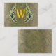 Monogramdesign, med en öppen krans, med två gyldade stam från löv, i guld, oliver, brons och svart utsegling mot a, spräckt, texturerat, bakgrund av brunt, brons och svart.