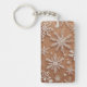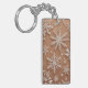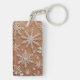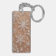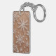 This delicate composition celebrates the intricate beauty of nature through a series of highly detailed snowflakes set against a warm, sandy ochre background. Each snowflake is rendered with fine, lace-like precision in a crisp white, creating a striking contrast that emphasizes their unique hexagonal symmetry. The background features a subtle, speckled texture reminiscent of falling frost or a light dusting of snow, while the overall warm tone lends a sophisticated, vintage holiday aesthetic to the piece. The arrangement is organic yet balanced, capturing a frozen moment of winter elegance.