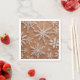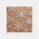 This delicate composition celebrates the intricate beauty of nature through a series of highly detailed snowflakes set against a warm, sandy ochre background. Each snowflake is rendered with fine, lace-like precision in a crisp white, creating a striking contrast that emphasizes their unique hexagonal symmetry. The background features a subtle, speckled texture reminiscent of falling frost or a light dusting of snow, while the overall warm tone lends a sophisticated, vintage holiday aesthetic to the piece. The arrangement is organic yet balanced, capturing a frozen moment of winter elegance.