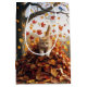 En orange katt leker till fullo ut ur en pulserande pil av höst löv, dess lekande anda fångade upp årens innersta väsen medan en blåkö vaknar uppifrån. Text kan ändras.