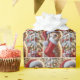 En gyllene hämtare med en julklapp som håller en julklapp med en ingerkatt inuti omgiven av festliga helgdag och träd