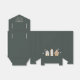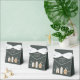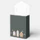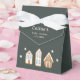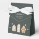 Modern Christmas theme baby shower favor box featuring illustration of gingerbread houses with blue accents.