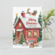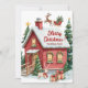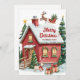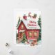 En elegant vinterdesign med ett hus i pepparkakor, flygande renar, granar med stjärnor och presenter.