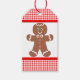 Den här lycklig-gingerbrödspojken bär en båge och tre röda knappar på kostym. Märkrn har en röd gingham gräns och texten "God jul!" på baksidan.