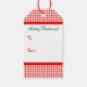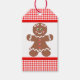 Den här leende gingerbrödflickan har två bröd i håret och röda knappar på klänningen. Märkrn har en röd gingham gräns och texten "God jul!" på baksidan.