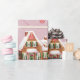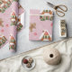 Ett sött brödhus, kakor av pepparkaksgubbe och pepparmyntgodis sätts på en söt rosa med subtil linjer av poinsettias för att göra denna söta, nostalgiska julomslag papprare.