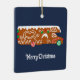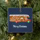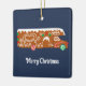 På framsidan av denna julprydnad visas en illustration av en gingerbrödkamera. Festiv cookie RV dekoreras med vit isbildning och rött och grönt godis och ställs mot en marin blå bakgrund. God jul-meddelandet under grafikobjektet kan vara personlig med din egen text. Den omvända sidan av dekorationen är redot som ska anpassas med ditt eget foto, perfekt för att dela ett semesterminne.