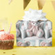 En nalle med en rosa och vit gingham mönster sitter på en vit, elegant stol, försedd med en båge och små blommor på örat.