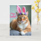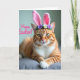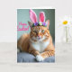 Det här kortet visar en orange tabbymössa som är vänd framåt med gyllengröna ögon som verkar möta dina med en vänlig, nästan flirtig fokus 🐇. Mjuka rosa kaninöron sitter på dess huvud, och en liten blomsterkrans av vita och lila blommor med gröna blad ger en mjuk, vårtonad touch 🌷. Katten vilar på en dämpad grå tyg-yta med sina främre tassar i kors, vilket ger en lugn och sällskaplig look, som om den väntar bredvid någon den tycker om. Varm, mjuk belysning framhäver den orange pälsen och mörkare ränder medan den lyser upp den vita bröstet och fina morrhår. I bakgrunden bleknar scenen till en jämn oskärpa så att katten stannar tydligt i centrum. En glad rad rosa text placeras över bilden och sticker ut mot de mjukare ton