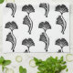 Minimalistiskt linjeutskrift av lodrät gingko löv i svartvitt.