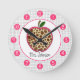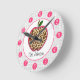 A clock for teachers featuring an illustration of a giraffe print apple Personalize with your name under apple. Clock features white numbers on pink dots.