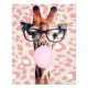 Giraffe bär glasögon och blåser en rosa bubbelgum med baksida på djuret.
