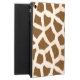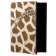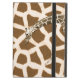 Roligt iPad Air fodral, med byggt stativ, och grafik av brunt och brunt i giraffe päls mönster. Ett grafiskt förbättrat foto av en giraffes huvud och nacke sträcker sig över fodral framsida. Den bruna texten på framsidan är redot att anpassa sig själv eller som en underbar presentidé.