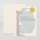 En modern inbjudan till babydusch med en illustration av en giraff med blå himmel, sol och moln. Inbjudan har ett modernt system och en modern utformning för färg i neutralt. Anpassa texten.
